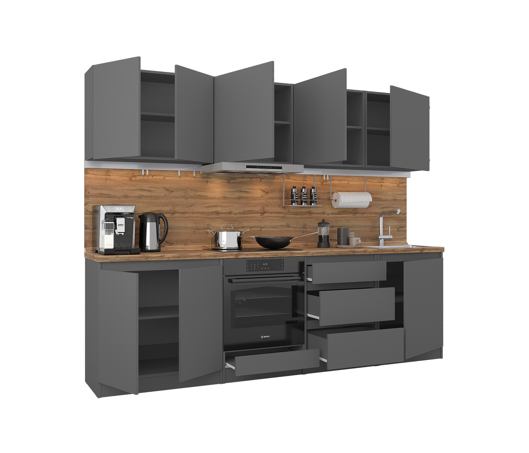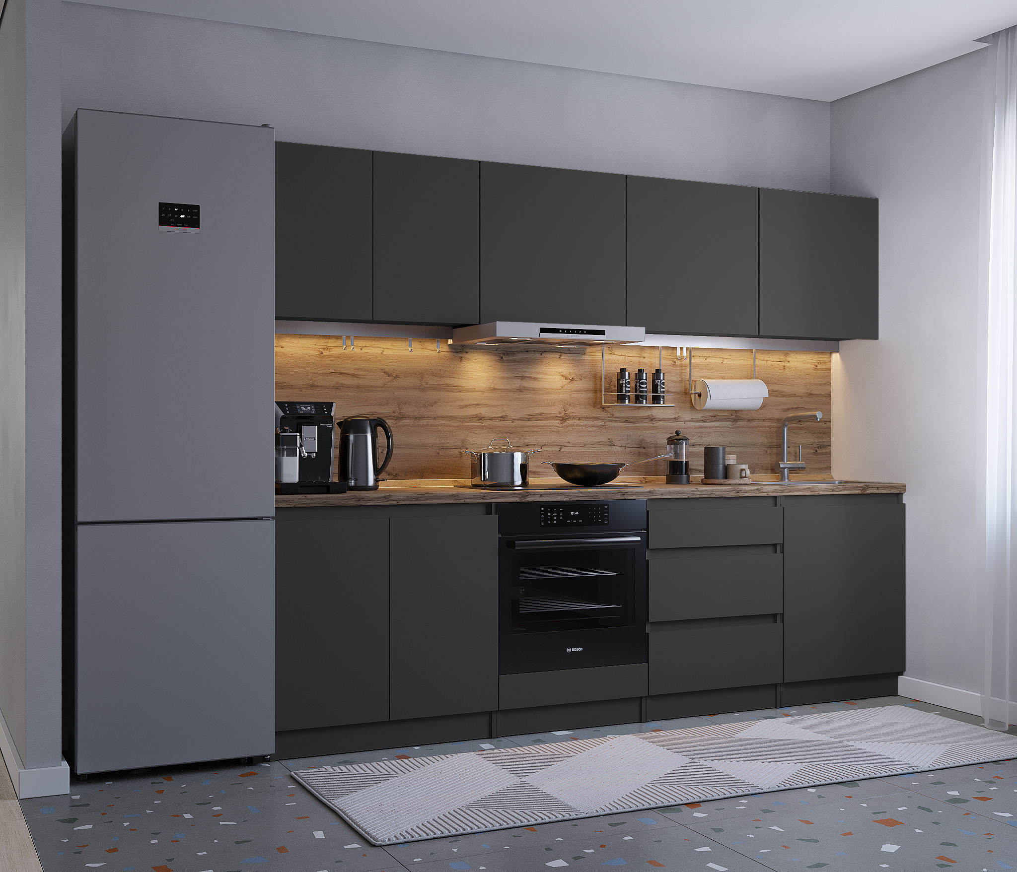 Обратите внимание, что столешница, стеновая панель, мойка и смеситель не входят в комплектацию кухни Леон и приобретаются отдельно. Это позволяет вам выбрать идеальные аксессуары и элементы для создания индивидуального дизайна вашей кухни.