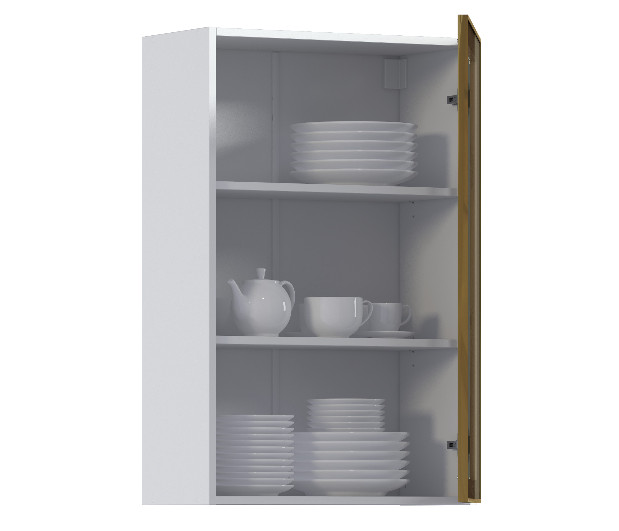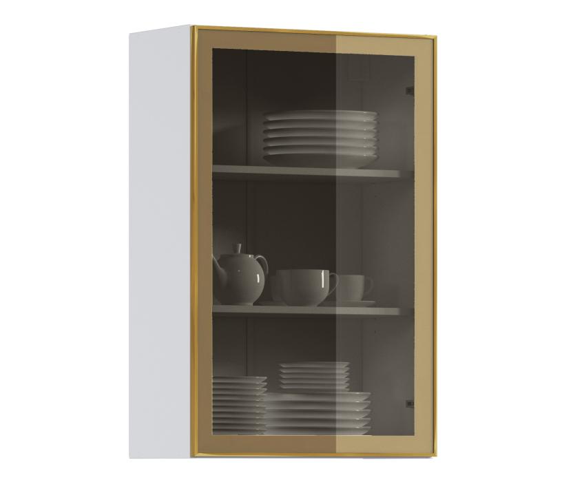 Комплект включает в себя корпус кухонной полки (белого цвета) с необходимой фурнитурой, фасад из алюминиевой рамки золотого цвета и бронзового стекла, а также ручку, соответствующую цвету рамки фасада.