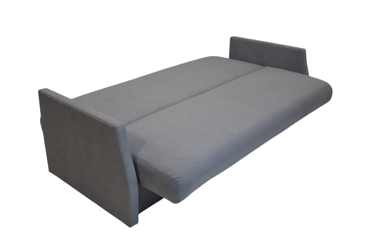 Габариты: 1950*600*1100; Спальное место: 1900*1200. Ткань - подлокотники - к/з, сиденье - велюр. Материалы: пиломатериал хвойных пород, фанера, ДВП, ДСП. Синтепон, войлок, пружинный блок. Механизм книжка. Ящик для белья.
