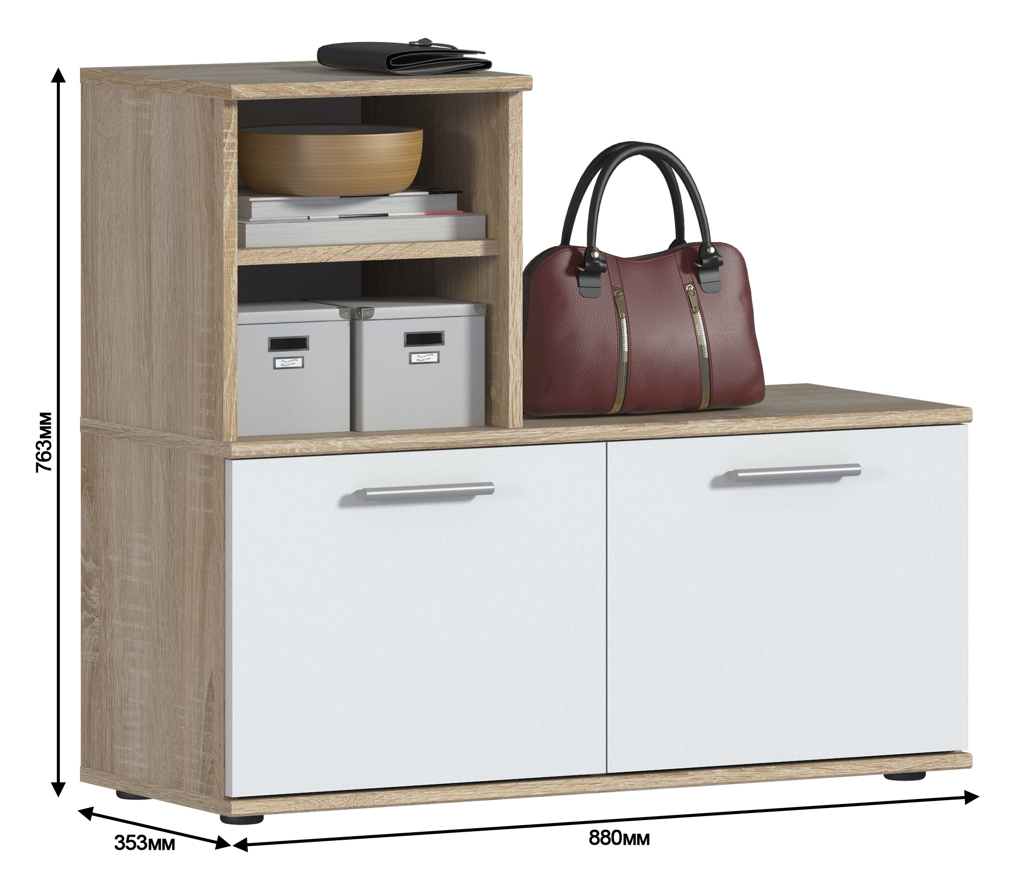 Габаритные размеры – ширина 87 см, высота 76 см и глубина 35 см. В двух вместительных отделениях тумбы помещается до восьми пар обуви. Каждое отделение имеет отдельную дверцу. На двух открытых полках можно хранить различные мелочи. Тумба произведена из экологичного прочного КДСП, устойчивого к мелким механическим повреждениям. Отделка комбинированная – корпус в цвете «Дуб Сонома», фасадные поверхности чисто белые. Тумба снабжена протекторами, которые сберегут пол от царапин.