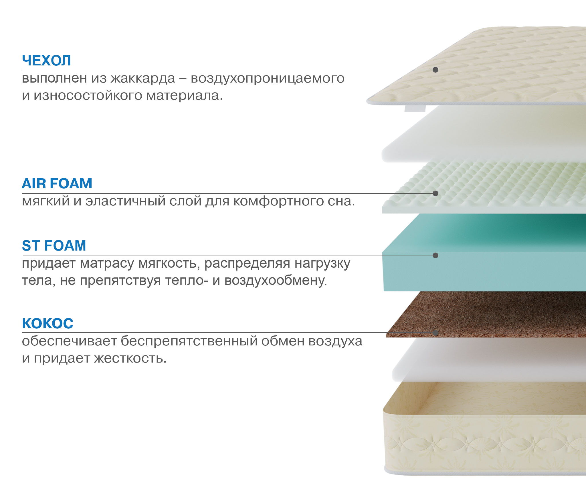 Матрас: Пенополиуретан Н100мм , ВI-COCOS Н10мм, Поролон HS ячеистый Н25мм