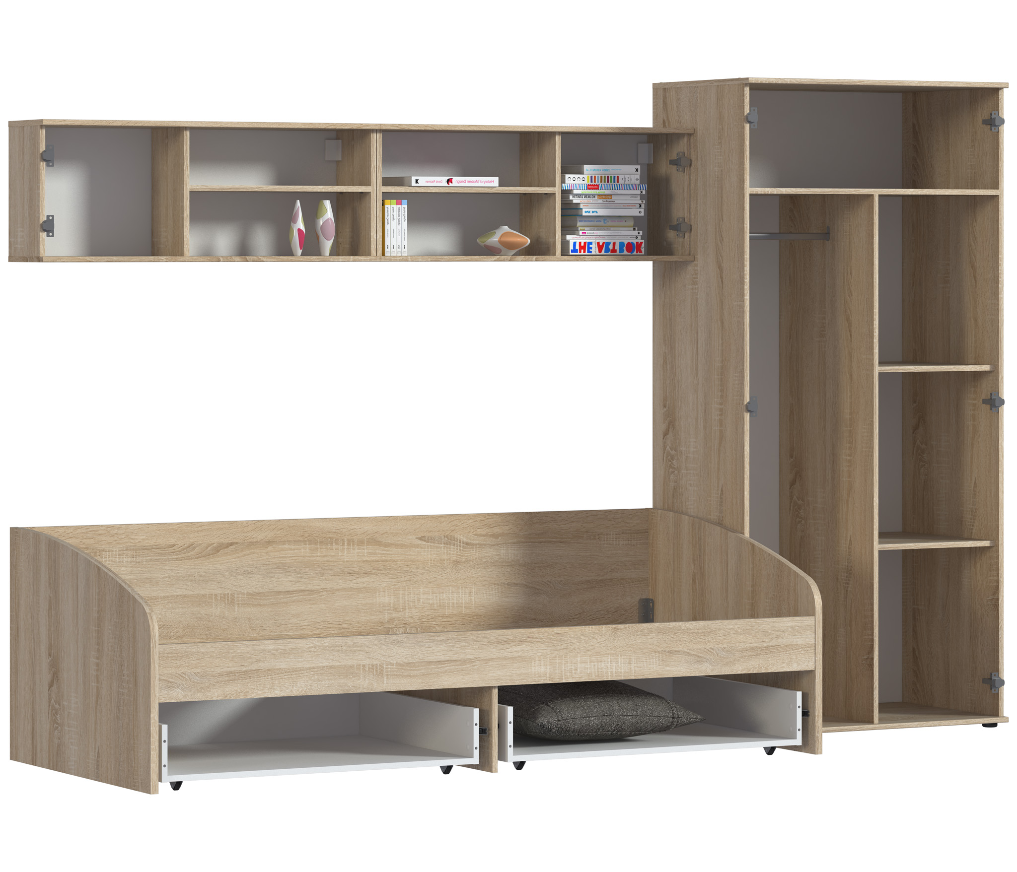 Комплект детской мебели «Мамбо»– идеальный вариант для комнаты подрастающего непоседы. Приятная глазу цветовая гамма придаст помещению современный и, в то же время, уютный вид. Корпуса мебели выполнены из ДСП в цвете «Дуб Сонома», фасады ящиков, полок и шкафа имеют светлый оттенок. Удобная и просторная кровать, оборудованная двумя вместительными выдвижными ящиками, обязательно понравится вашему ребенку, две настенные полки помогут создать и поддерживать в комнате надлежащий порядок, а 2-х дверный шкаф возьмет на себя функции по сохранению и складированию повседневных и праздничных детских вещей.