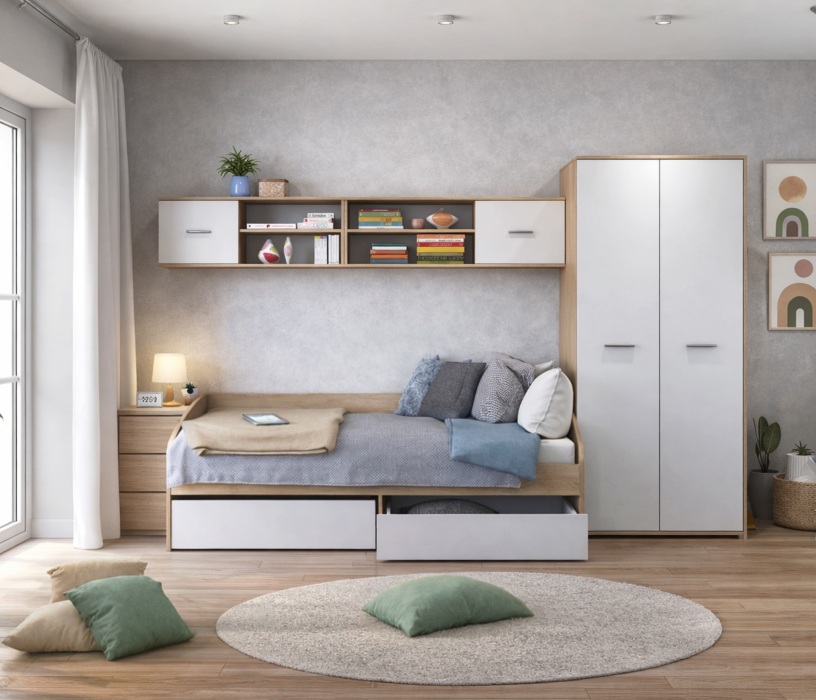 Данный комплект заказывали сыну в детскую комнату,пока он маленький,чтобы также служила в качестве комнаты для гостей. Мебель очень понравилась, качественная, красивый цвет. Дополнительно заказали стол и матрас. Также планируем ещё заказать тумбочки и комната обставлена за такие небольшие деньги. Единственный минус - не все отверстия на мебели высверлены,но это дело поправимое,муж собрал быстро. Мебель привезли через 2 недели после заказа в связи с огромным количеством заявок именно на эту мебель из-за хорошей скидки. Данный комплект рекомендуем)