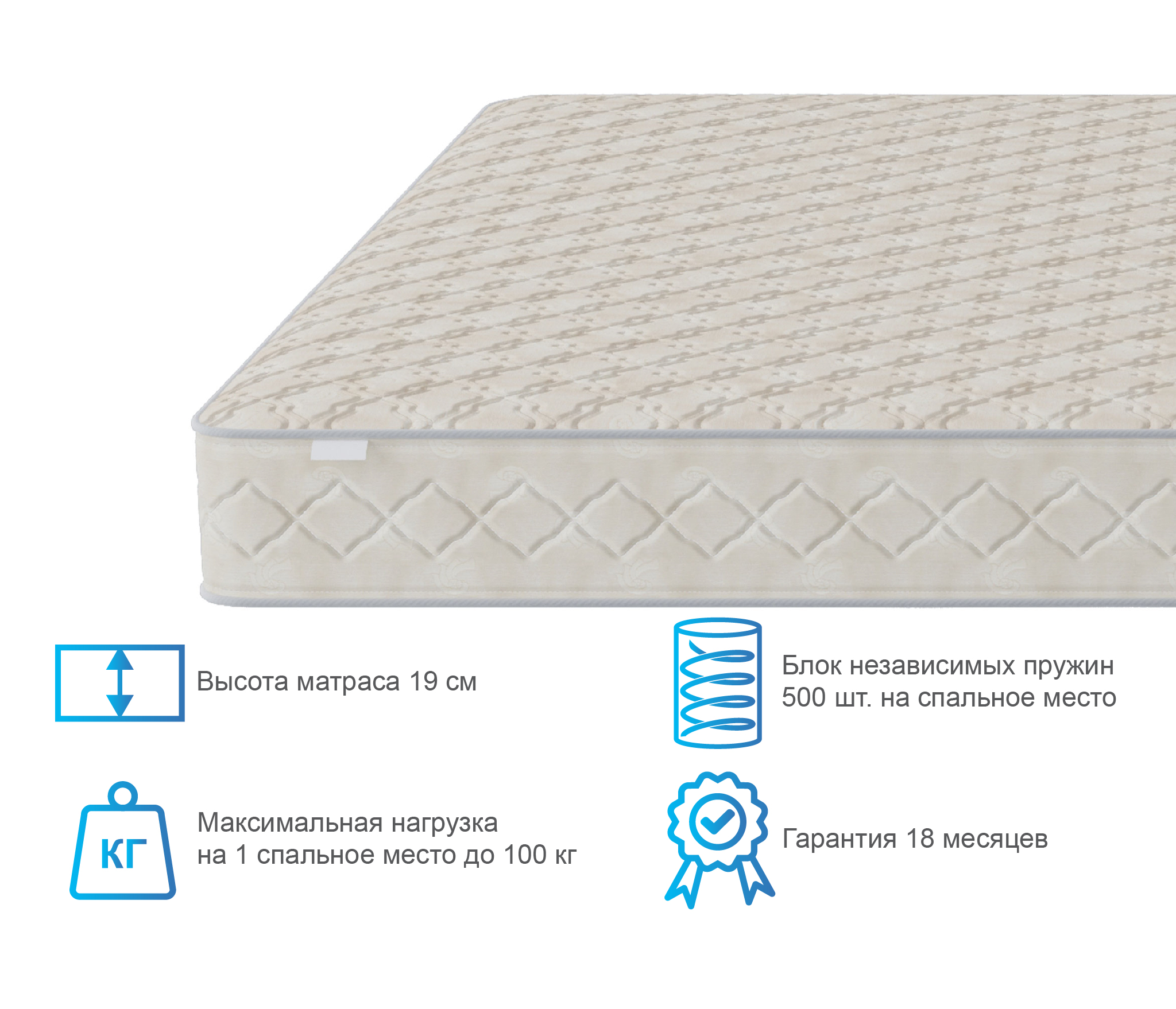 Чехол из хлопкового жаккарда обеспечит надежную защиту матрасу и сохранит превосходный внешний вид на долгие годы. Материал экологически чистый, не вызывает аллергии и тем самым отлично подходит для людей склонных к аллергии. Модель рассчитана на нагрузку в 100 кг на одно спальное место.