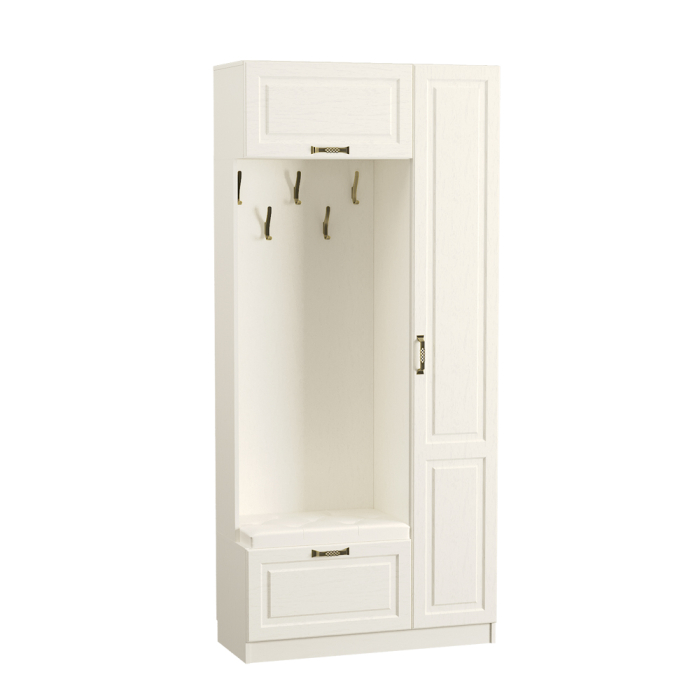 Ливерпуль 13.21 Изысканный шкаф в колониальном стиле преобразит прихожую и подарит ей уникальное сочетание европейского комфорта и восточного колорита. Конструкция состоит из открытой ниши с крючками для верхней одежды, закрытого вертикального блока с полками и двух ящиков для хранения необходимых предметов. Верхний ящик оснащен откидной дверцей, а нижний имеет выдвижной механизм. Поверхность нижнего ящика оборудована мягким элементом, на который можно присесть для переобувания.