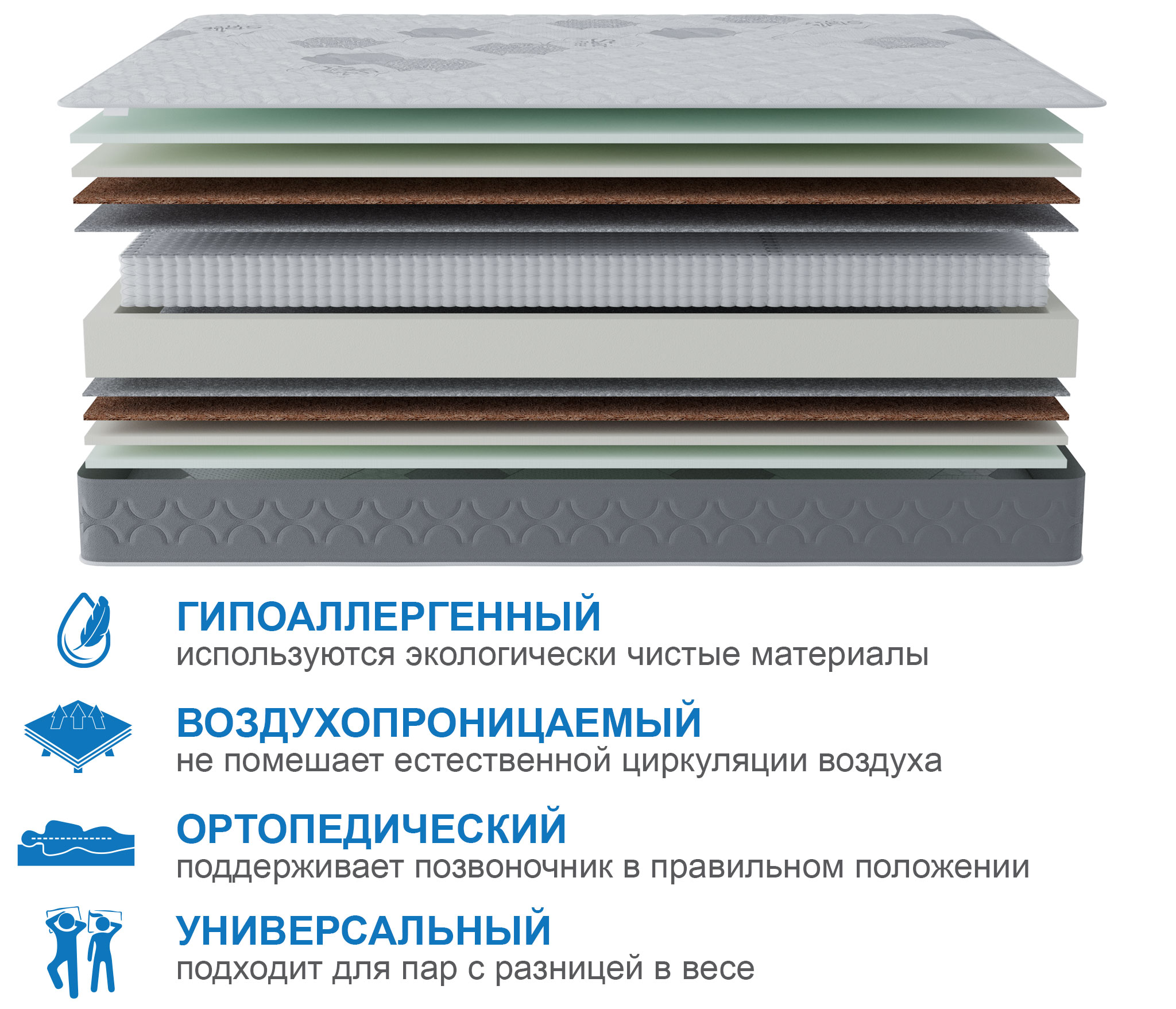 С обеих сторон матраса в качестве комфортного слоя используется 2 см искусственного латекса, этот материал очень долговечный и упругий, благодаря этому слою на этом матрасе будет одинаково комфортно людям разных весовых категорий. Для распределения нагрузки и придания необходимой жесткости используется латексированный кокосовый лист, который кладется под латекс. В основе матраса лежит блок независимых пружин, благодаря которому матрас будет индивидуально подстраиваться под каждого спящего и оказывать обратное давление только там, где это действительно необходимо. Чехол матраса сделан из плотного мягкого трикотажа, который стегается на 15 мм пене и синтепоне, что добавляет не много мягкости. Обращаем ваше внимание на то, что любой матрас отвечает за правильность положения во время сна нижнего и среднего отделов позвоночника, а за правильность положения шейного отдела отвечает правильно подобранная ортопедическая подушка. Рекомендуем использование с защитным чехлом AquaStop.
