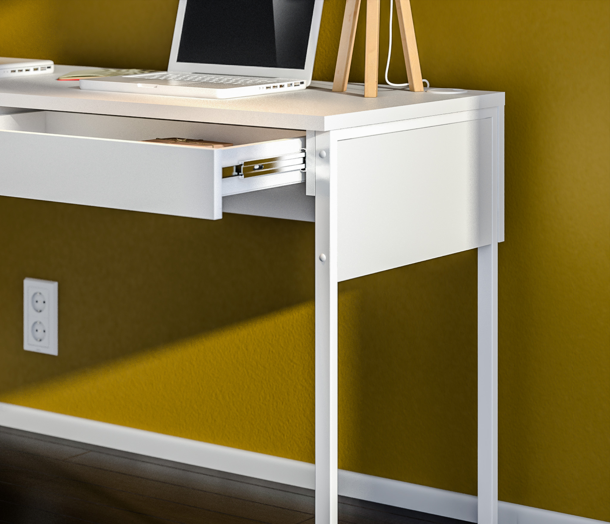 У стола имеется специальная заглушка для проводов, которая позволяет аккуратно спрятать провода от компьютера, лампы или других устройств.